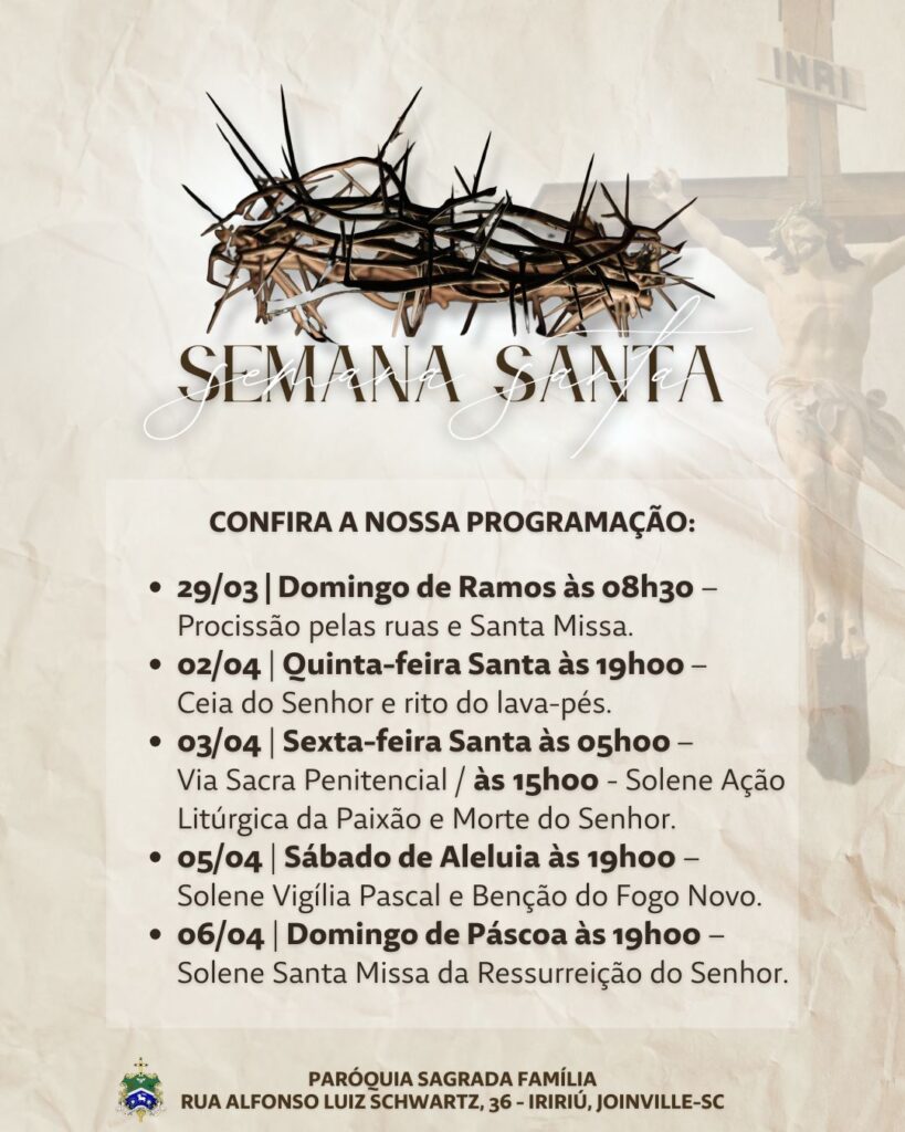 A Paróquia Sagrada Família, situada em Joinville, apresenta à comunidade diocesana a programação oficial da Semana Santa, período de grande relevância no calendário litúrgico da Igreja.